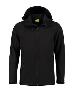 Lemon & Soda softshell unisex jack met capuchon en twee zakken met rits van een hoogwaardige kwaliteit. Softshell is te borduren en hierdoor is het jack in te zetten als gepersonaliseerde promotiekleding of bedrijfskleding.
