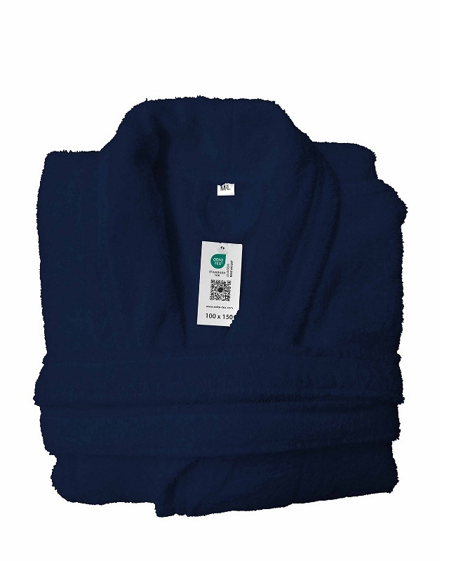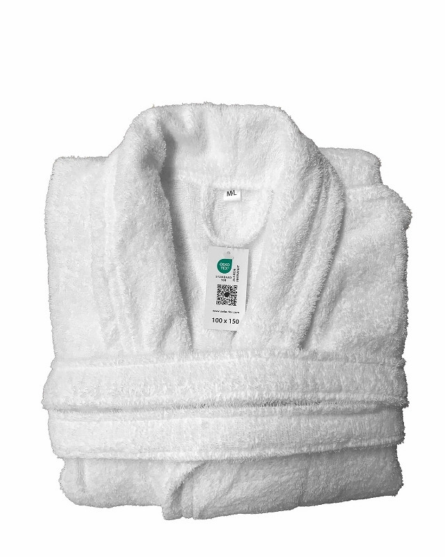 The Olima bathrobe combines comfort and quality. Made from 100% ring-spun cotton (330 gr/m²), it feels soft and offers excellent absorbency. The shawl collar, belt with loops, and practical hanging loop provide added convenience. OEKO-TEX® certified and suitable for embroidery, making it ideal for hotels, wellness environments, and professional use. Available in multiple sizes.