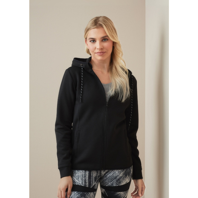 Stedman gerecyclede scuba jas met capuchon met twee-kleurig koord en flatlocknaden voor dames. Gemaakt van milieuvriendelijk gerecycled materiaal waarin acht gerecyclede plastic flessen verwerkt zijn.